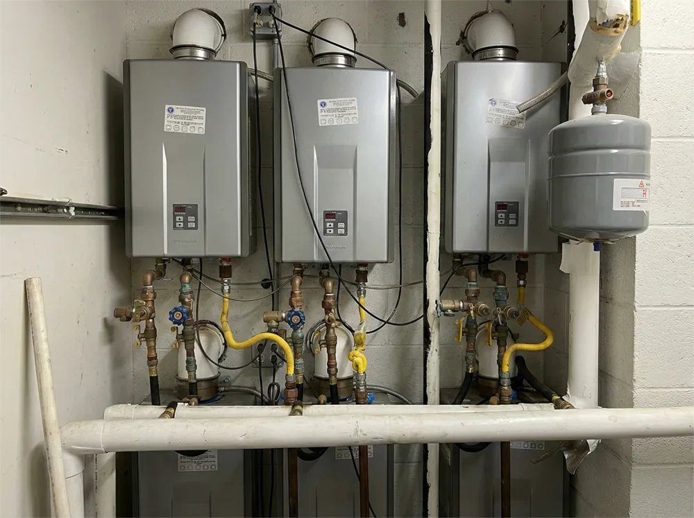 A bank of tankless water heaters